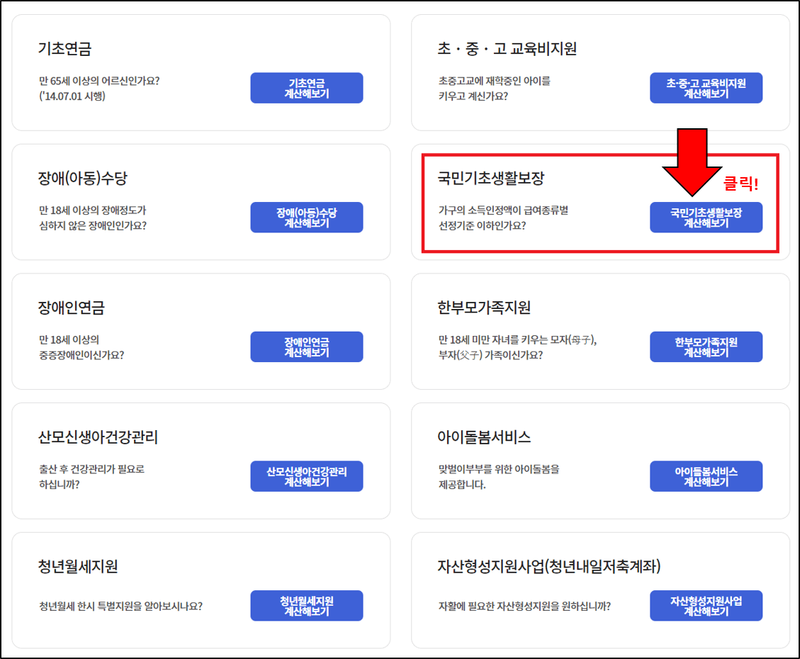 링크로 들어가서 국민기초생활보장 계산해보기를 클릭하셔서 조회를 해보시기 바랍니다. 이 이외에도 다양한 지원대상 조건들을 확인할 수 있으니 확인보시기 바랍니다.