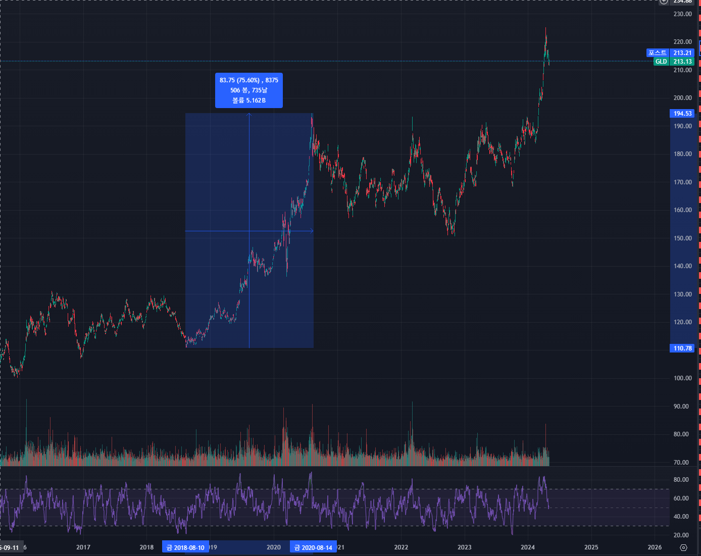 현재 금리는 고금리가 유지되어 있습니다. 작년 재작년 금리 인상으로 인한 불바다 지옥이었죠.. 이제는 물가도 어느 정도 잡혔고, 금리를 인하할 시그널들이 나오고 있습니다. 기본적으로 금리가 인하하게 되면 돈의 가치가 떨어지고 자산 성격을 가지고 있는 자산들의 가격이 올라가는 특성을 볼 수 있습니다. 현재 금리 인하를 하진 않았지만 금리를 이제는 내릴것이라는 기대감으로 인해 금 가격의 변동이 있는 거 같습니다. 아래 그래프를 한번 보시겠습니다.
