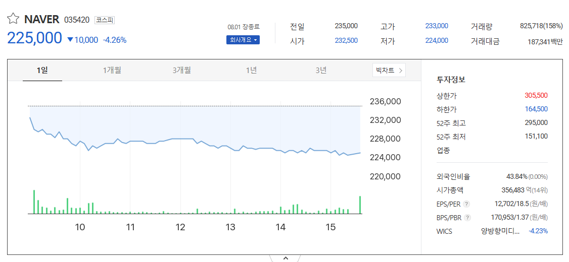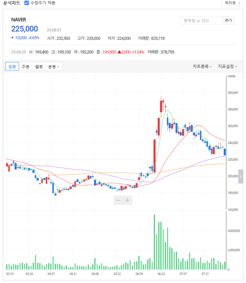 네이버의 주가 흐름과 거래량 변화를 실시간으로 확인하세요.