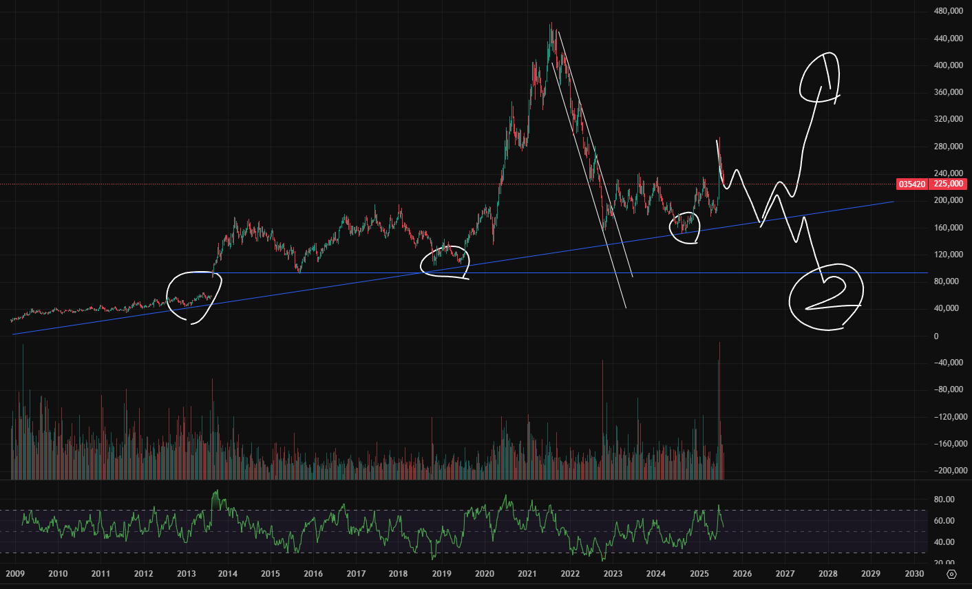 - 종합분석: 위 차트는 네이버 주봉차트입니다. 큰 시간 프레임으로 보니 2009년부터 지금까지 가격이 지속적으로 상승하고 있는것을 볼 수 있습니다. 거기다가 추세를 지켜주면서 말이죠. 현재 가능성은 일부 조정 후 1번과 같이 가냐, 추세선 아래로 떨어지냐인데, 장기추세선이기 때문에 이 아래로 떨어지긴은 힘들어 보입니다. 그렇기 때문에 1번에 가능성을 두고, 장기 투자자라면 상승 장기 추세선을 보고 그 시점에 맞춰서 매수를 하는 것도 방법일 수 있을 것입니다. 목표가는 전고점 뚫는 것?