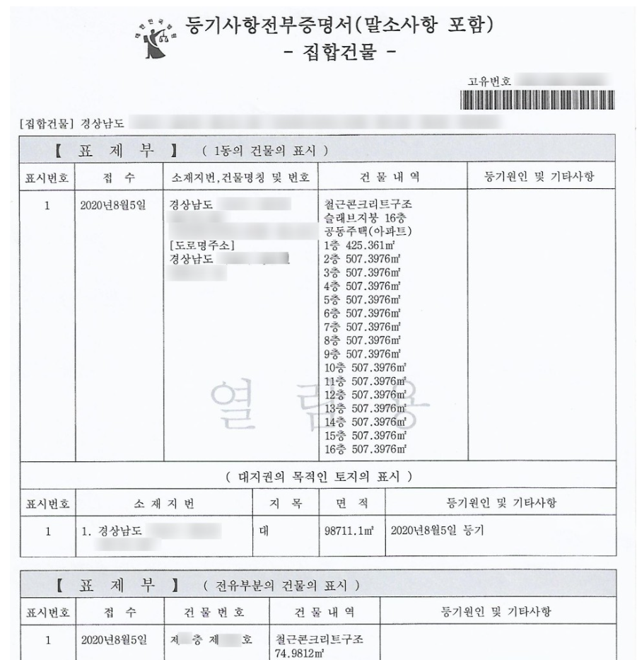 부동산 등기부등본 첫단에 나오는 것은 표제부 입니다. 표제부는 부동산의 면적이라던지, 층수, 소재지번, 건물명칭, 건물내역, 등기원인 및 기타사항이 표시되어 있습니다. 우리가 보는 부동산의 정확한 주소를 확인할 수 있고 건물의 층수나 지어진 소재 등에 대해서도 확인할 수 있습니다. 보통 부동산 거래를 할때 임대차 계약서를 작성하게 됩니다. 임대차계약서 내에 표제부에 나와있는 건물내역에 철근콘크리트조와 같은 건설에 사용된 자재와 대지권비율을 작성하게 되어있습니다. 이 부분을 등기부등본을 보고 확인할 수 있는 겁니다. 그리고 해당 부동산의 지목도 확인할 수 있습니다. 지목이 전이나 답 과수원 임야 등으로 구분되어 있습니다. 여기서 말하는 '대'는 택지조성 공사가 준공된 토지를 말하며 대부분의 사람들이 알고 있는 일반적인 토지라고 생각하면 됩니다. 이를 통해, 해당 부동산이 불법적인 토지가 아닌 정상적인 토지에서 지어진 건물인지 확인할 수 있는 겁니다. 또한, 건물내역에서는 각 층별로 면적을 확인할수가 있습니다. 해당 층수별로 면적을 확인하여 평형을 알수 있습니다. 부동산 매물을 확인하고 거래를 할때 등기에서 명시된 면적을 기준으로 매물거래가 되는 것입니다. 표제부는 가장 기본적인 사항을 표시하고 있으므로 부동산의 소재지번과 건물내역 그리고 언제 지어진 건물인지 정도만 알고 넘어가면 되겠습니다.