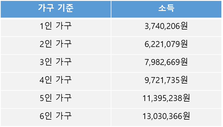- 가구소득 중위 180% 이하면 해당이 되는데, 계산식이 복잡해서 제가 계산해서 가져왔습니다. 아래 기준표를 참고하시면 됩니다.