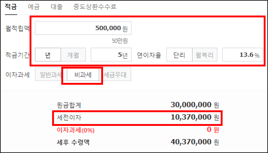 - 이자소득은 비과세 혜택적용을 받아 세금을 떼지 않습니다.
