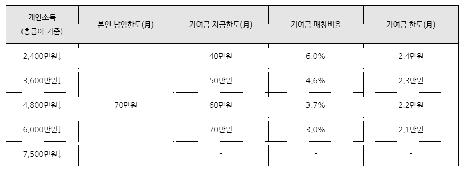- 개인소득 기준 : 총급여 기준 7,500만원 이하(정부기여금은 6,000만원 이하 소득에 따라 지급)