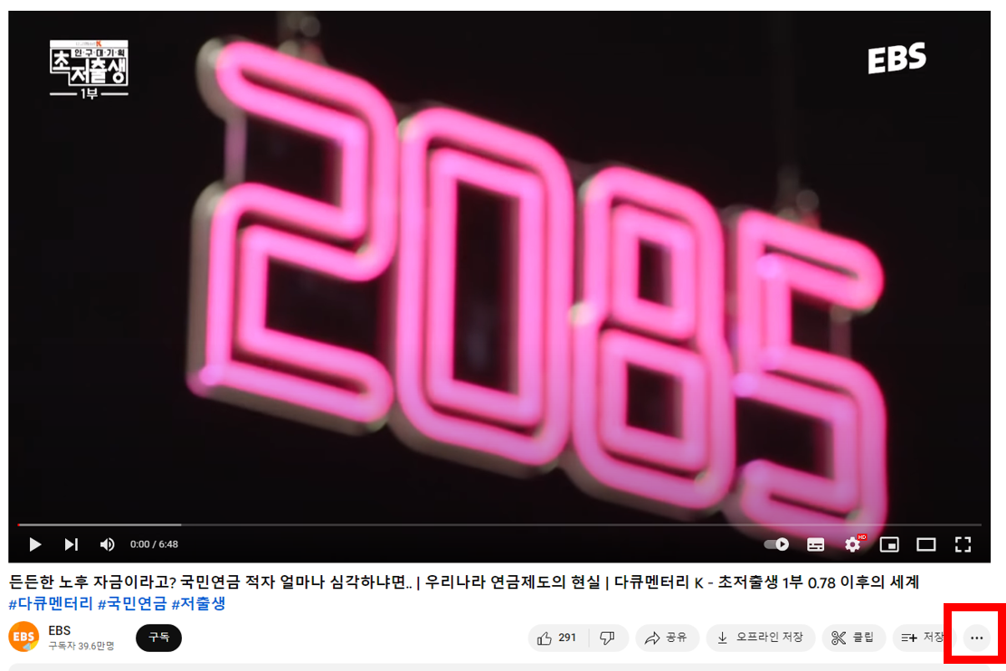 (1) 아래 사진 빨간색 네모로 표시한 것처럼 보고 있는 영상 우측 밑에 점 세 개를 클릭하고 스크립트 표시를 누릅니다.