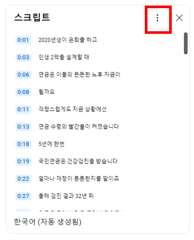 (2) 오른쪽에 표시된 스크립트를 확인하고 타임스태프가 적혀있는 그대로 글자를 복사해서 쓰셔도 되고, 깔끔하게 타임스태프 없이 글만 추출하고 싶다면 스크립트 우측에 있는 세로로 된 된 점 세 개를 클릭합니다.