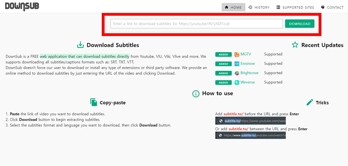 (1) 유튜브 링크를 복사하고 다운 섭 사이트로 이동합니다. 이동 후 해당 사이트에서 복사한 링크를 아래 빨간색 네모칸 있는 곳에 붙여 넣기하고 다운로드를 누릅니다.