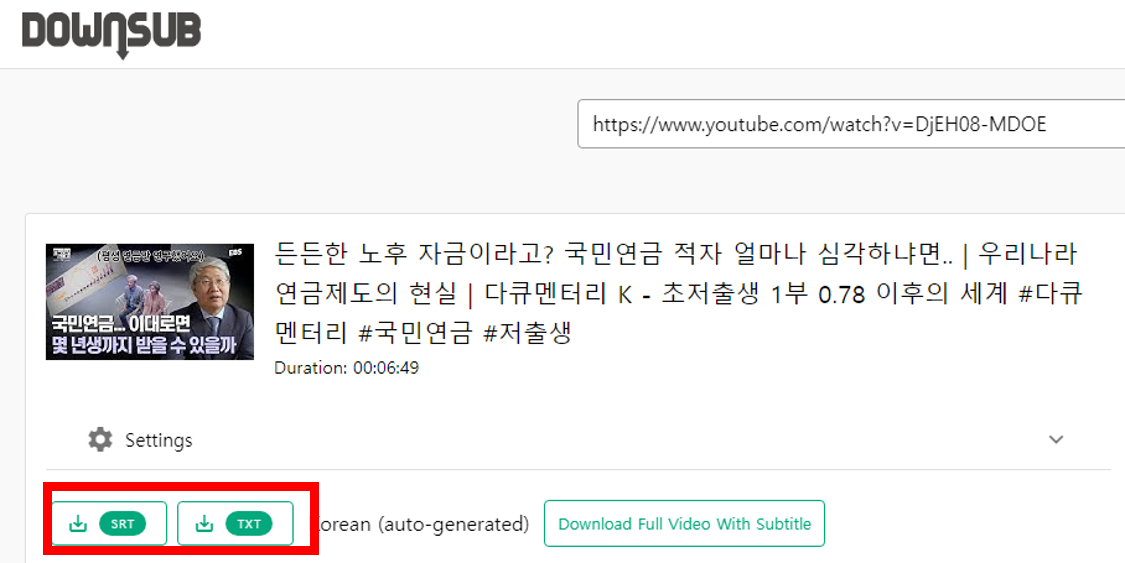 (2) 그럼 아래와 같이 영상을 불러오고 나서 5초도 안 돼 텍스트 문서가 생성됩니다. 해당 문서를 다운로드하여서 쓰시면 됩니다.
